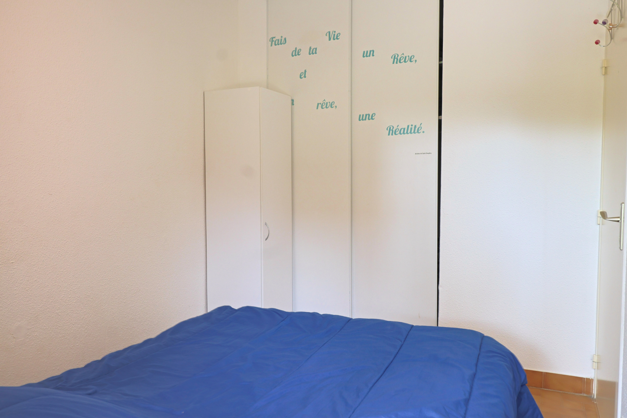 une chambre avec lit double (140 cm) et grand placard de rangement,
