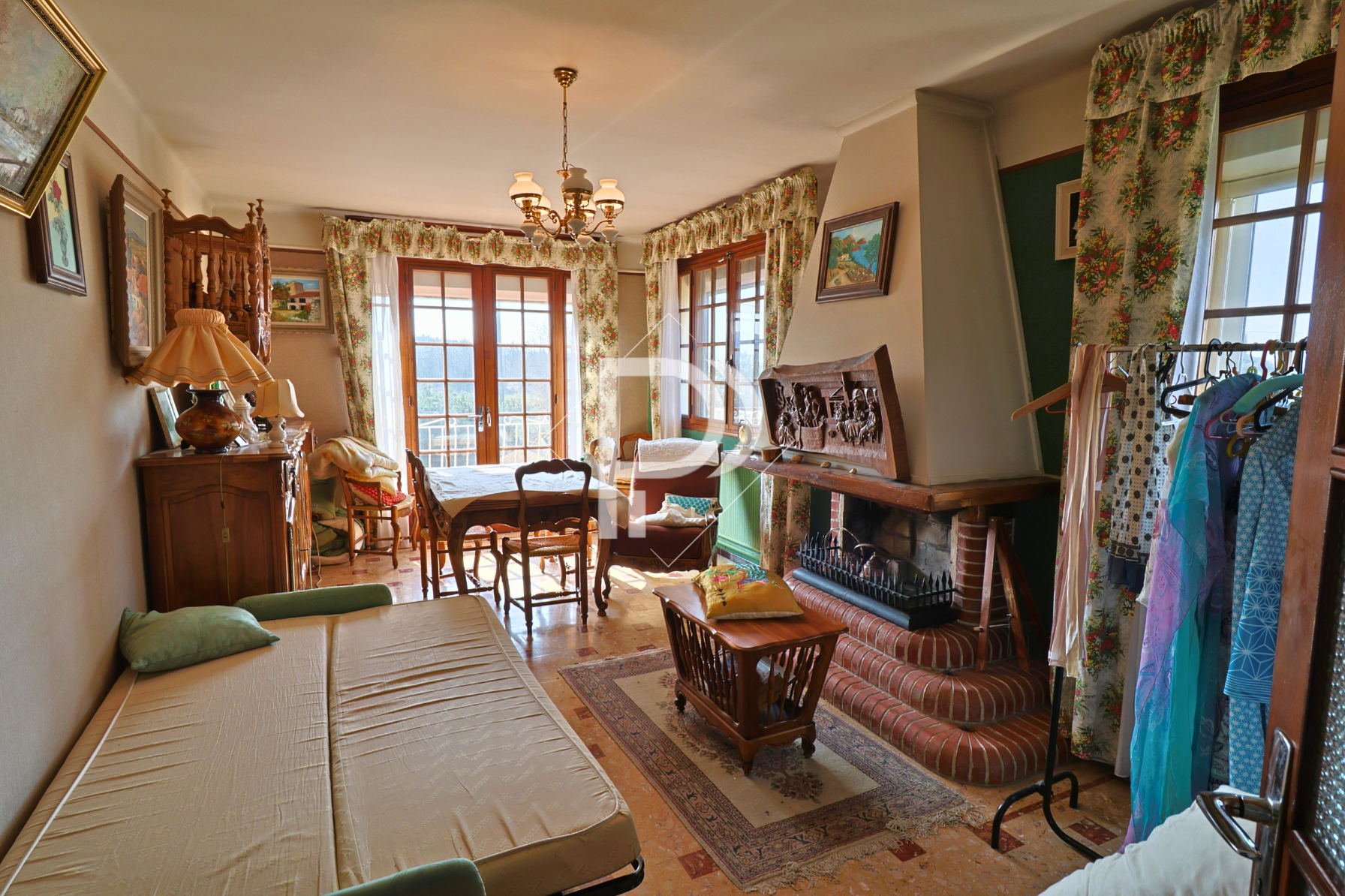 À l’étage, accessible également par une entrée indépendante, la maison propose un second espace de vie comprenant un séjour avec cheminée et balcon, une cuisine, quatre chambres, ainsi qu’une salle d’eau avec WC. Cette configuration permet d’envisager deux logements distincts ou une grande maison familiale.